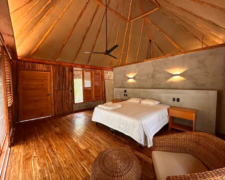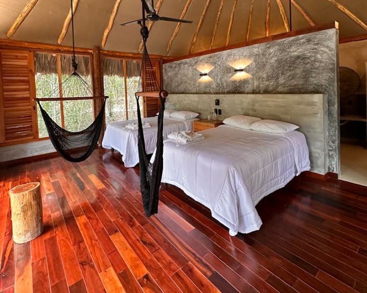 Disfruta de una estancia cómoda y relajante en el corazón de la Selva Maya. Nuestra amplia habitación, equipada con dos camas matrimoniales, perfectas para familias o amigos. El espacio cuenta con un baño privado con regadera, clóset para mayor comodidad y un área de descanso con sillas y hamacas tipo columpio, ideales para relajarse después de un día de exploración. Además, el ventilador de techo mantiene un ambiente fresco y agradable en todo momento. ¡Un refugio perfecto para tu descanso!