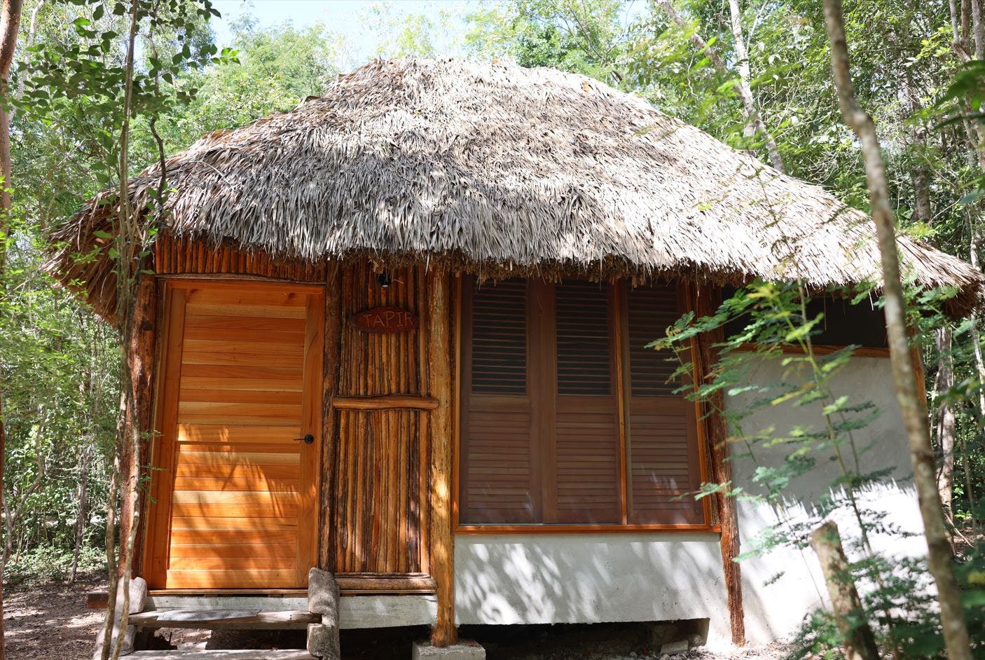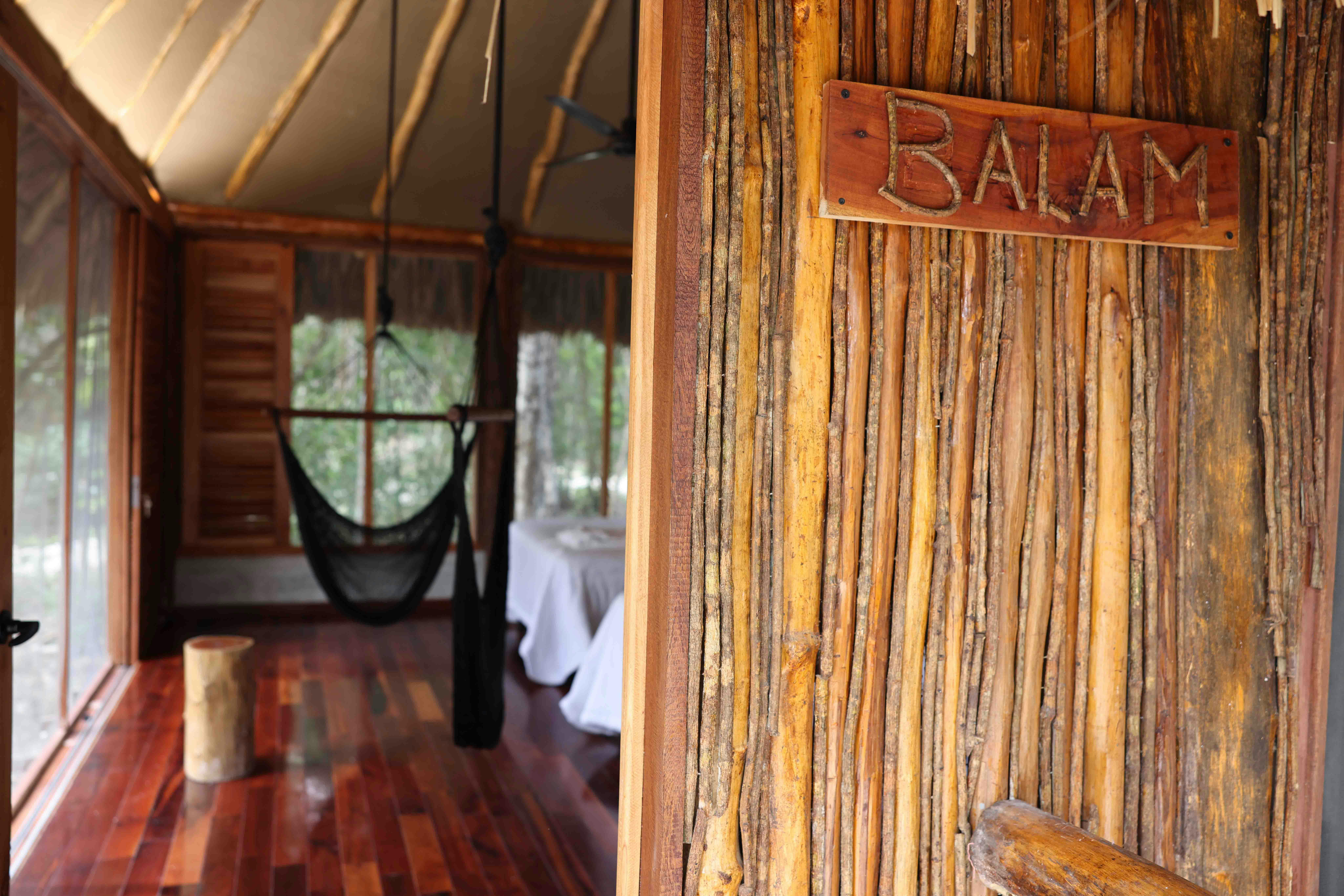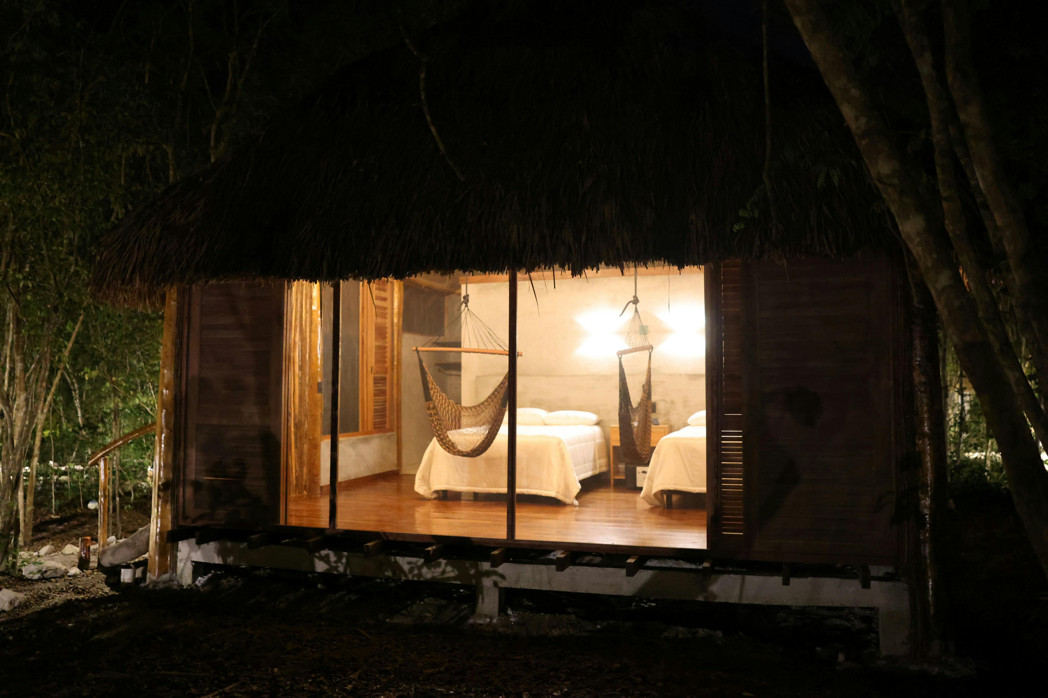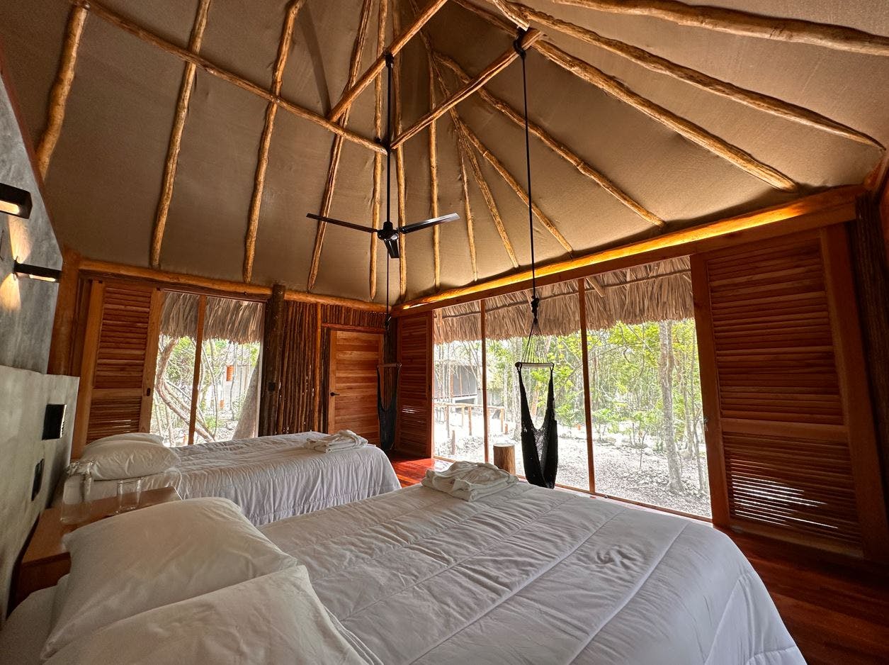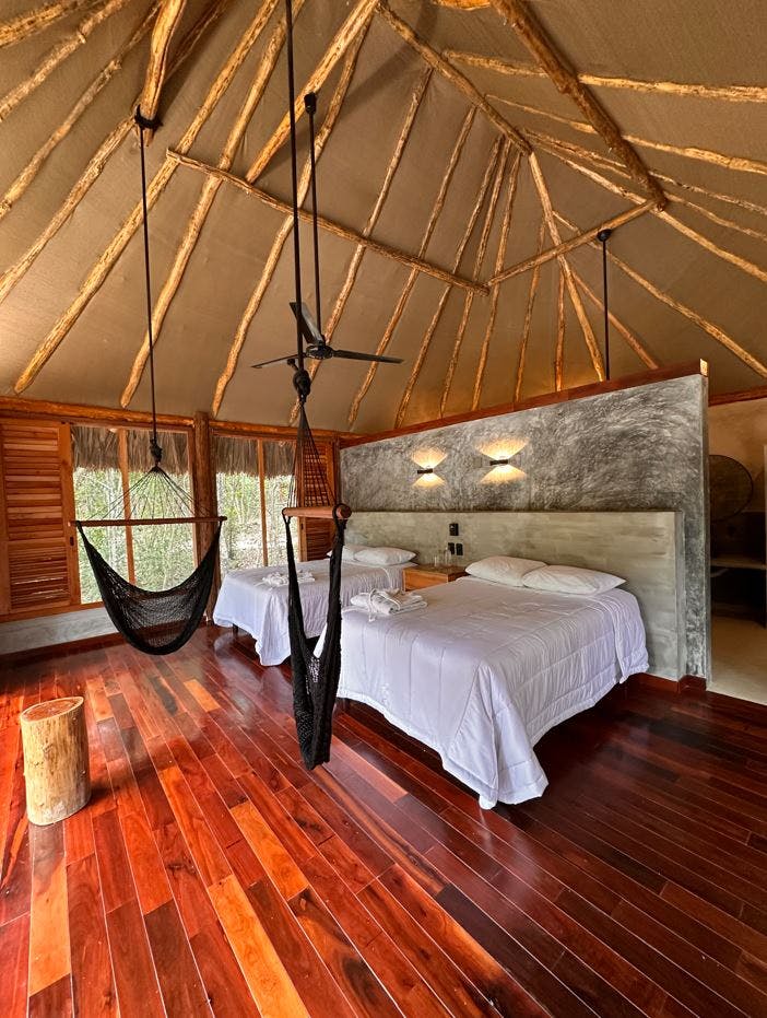 Disfruta de una estancia cómoda y relajante en el corazón de la Selva Maya. Nuestra amplia habitación, equipada con dos camas matrimoniales, perfectas para familias o amigos. El espacio cuenta con un baño privado con regadera, clóset para mayor comodidad y un área de descanso con sillas y hamacas tipo columpio, ideales para relajarse después de un día de exploración. Además, el ventilador de techo mantiene un ambiente fresco y agradable en todo momento. ¡Un refugio perfecto para tu descanso!