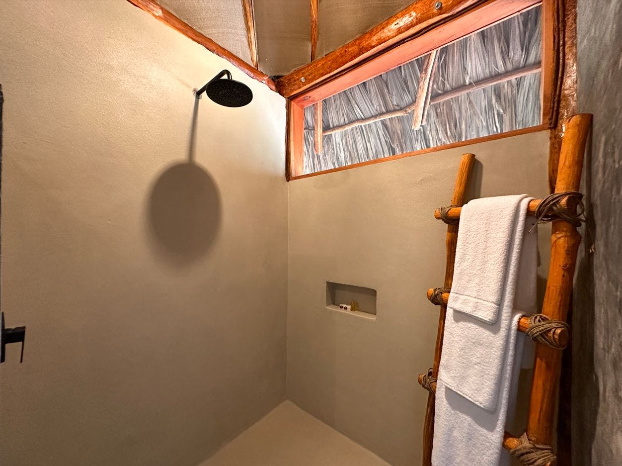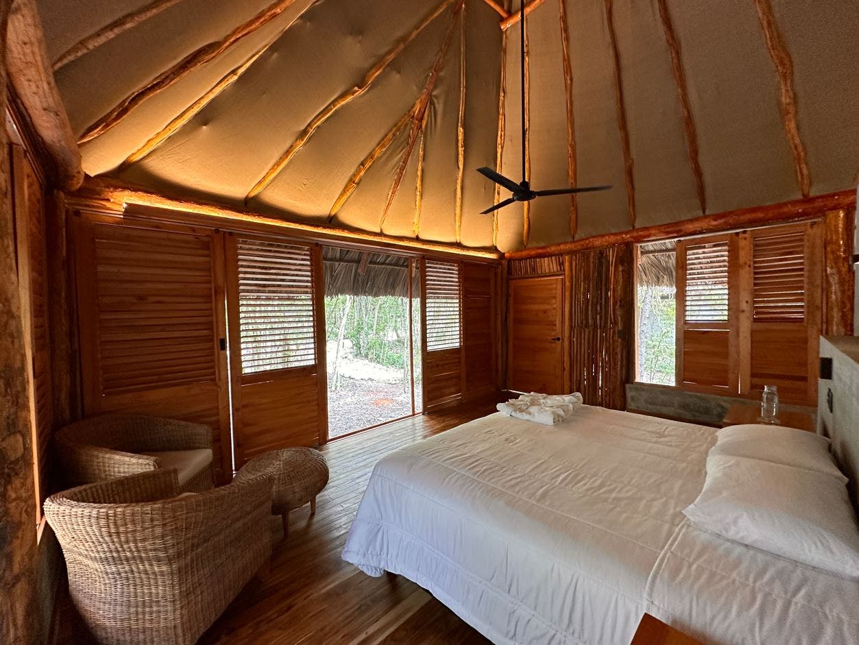 Sumérgete en el confort de nuestra espaciosa habitación, equipada con una cama King size, ideal para quienes buscan descanso y comodidad. Disfruta de un baño privado con regadera, un clóset para organizar tus pertenencias y un acogedor rincón con una mesa y 2 sillones, ideales para relajarte. Además, el ventilador de techo garantiza un ambiente fresco y agradable durante tu estancia. ¡El espacio perfecto para desconectarte y descansar plenamente!